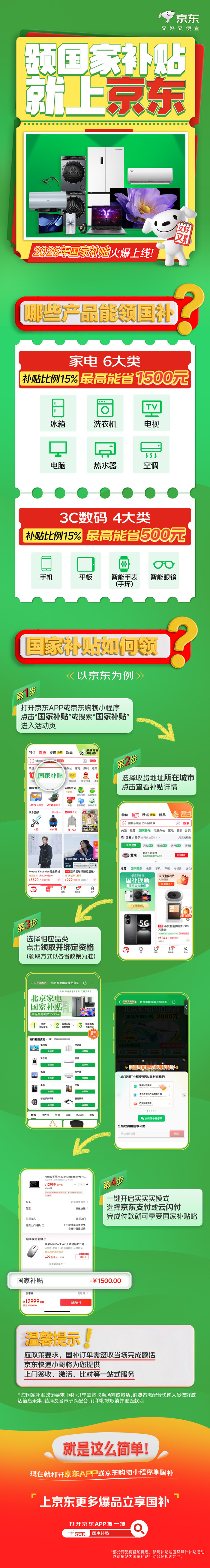 以京东为例,在国补使用方式上,消费者只需三步便能轻松获取2026国补省钱体验。第一步,打开京东APP,搜索“国家补贴”,即可抵达国补主会场;第二步,点击进入对应省市,按照页面提示领取国补资格;第三步,消费者可在会场浏览选购,也可直接搜索国补商品完成下单,完成国补减免!