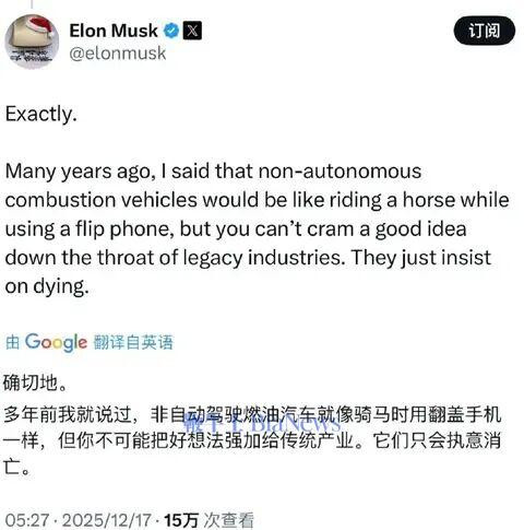 他还表示,“非自动驾驶燃油汽车就像骑马时用翻盖手机一样”。(转载自:电车界)